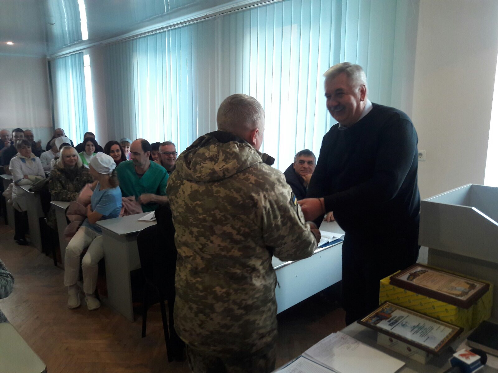 Присутні у залі – працівники шпиталю. Саме вони забезпечують безперебійну роботу закладу, вчасно надають допомогу пацієнтам, дбають про них та роблять все можливе, аби хворі якнайскоріше одужали.