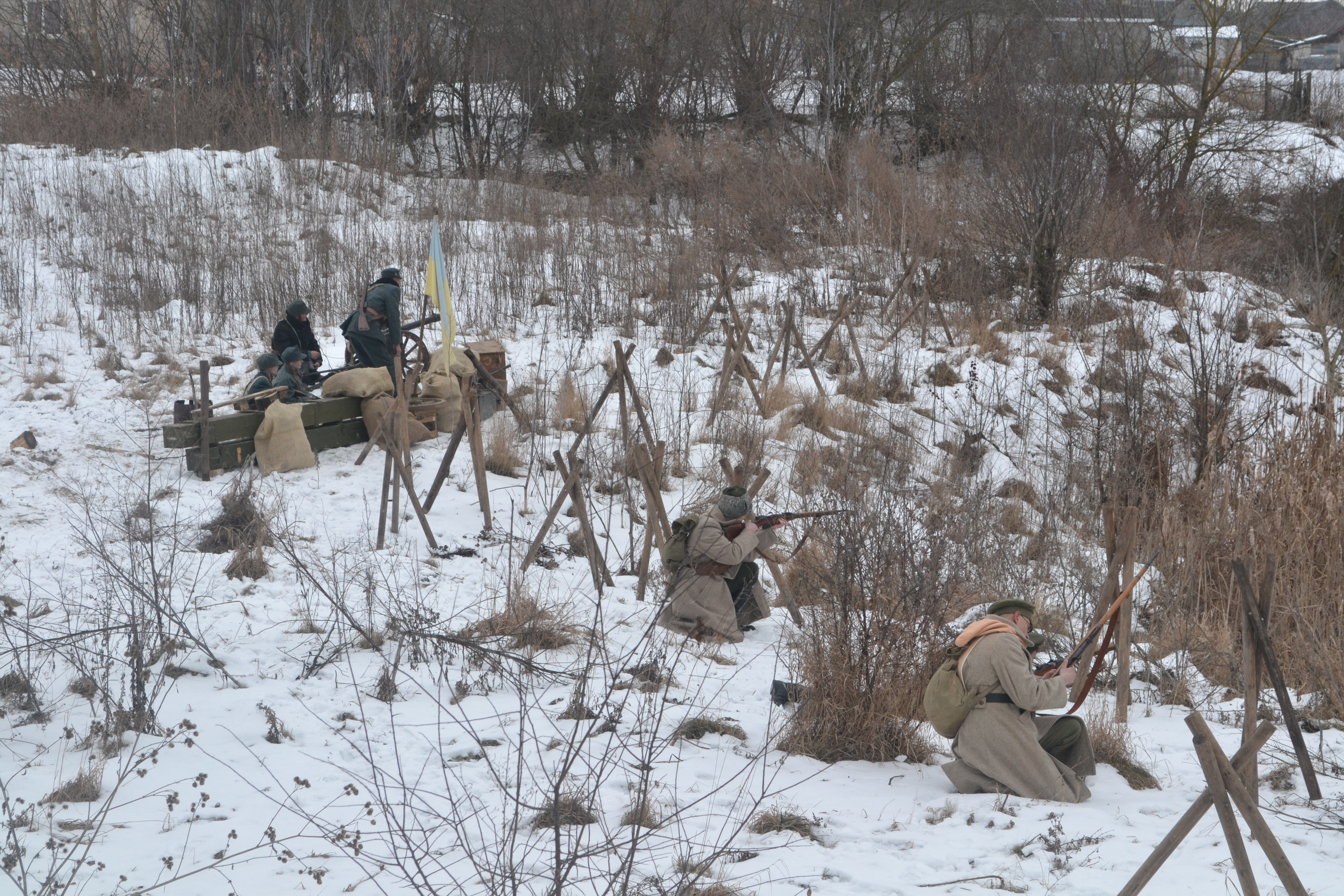 Пізніше епіцентром святкувань стало поле поблизу сцени – там розгорнулося справжнє театралізоване дійство. Реконструкцію подій сторічної давнини «Бій підрозділу війська УНР проти збройних відділів більшовицької Московії» відтворили члени громадської організації «Товариство пошуку жертв війни «Пам'ять» з міста Львова. Організатори зробили все можливе, аби кожен присутній став частиною буремних подій 1919 року. На імпровізованому фронті лунали потужні постріли, акторів одягнули у військову форму, виготовлену за точним зразком початку ХХ століття, а руках вони тримали оригінальну зброю, якій понад 100 років.