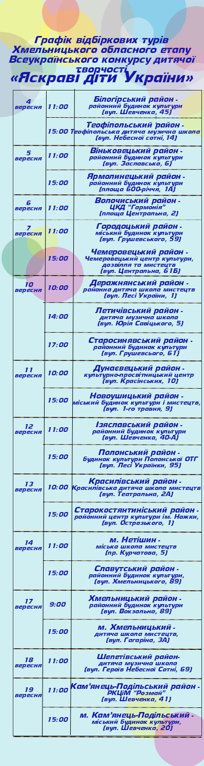 Юних талановитих вокалістів з різних куточків області запрошують до участі у конкурсі «Яскраві діти України». Другий рік поспіль на Хмельниччині грандіозне дійство проходитиме за сприяння народного депутата України Сергія Лабазюка та фінансовій підтримці його благодійного фонду «Ми поруч». Відбіркові тури стартують 4-го вересня.